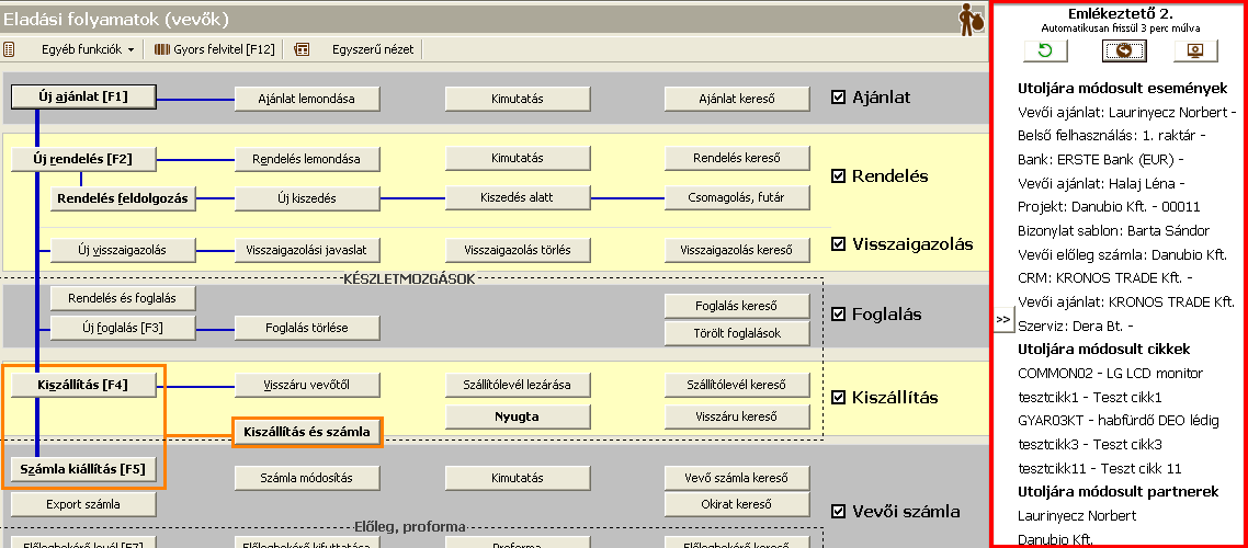 - Emlékeztető 2. drag & drop módszerrel. Az Emlékeztető 2. panelen lévő "Utoljára módosult események" és "Utoljára módosult partnerek" ráhúzható az Eladás és Vásárlás menüben lévő gombokra, így