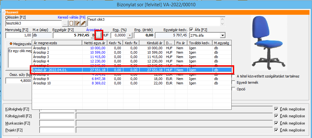 - Bizonylat sor ablakban az Egységár gombra [...] megjelenő táblázatban a szerződéses árak szövege jobban látszódik (pl. "(szerződés: valami)" helyett "(valami - szerződés)", az egységár feletti kék szöveg hosszabb, így jobban kifér a szerződés neve