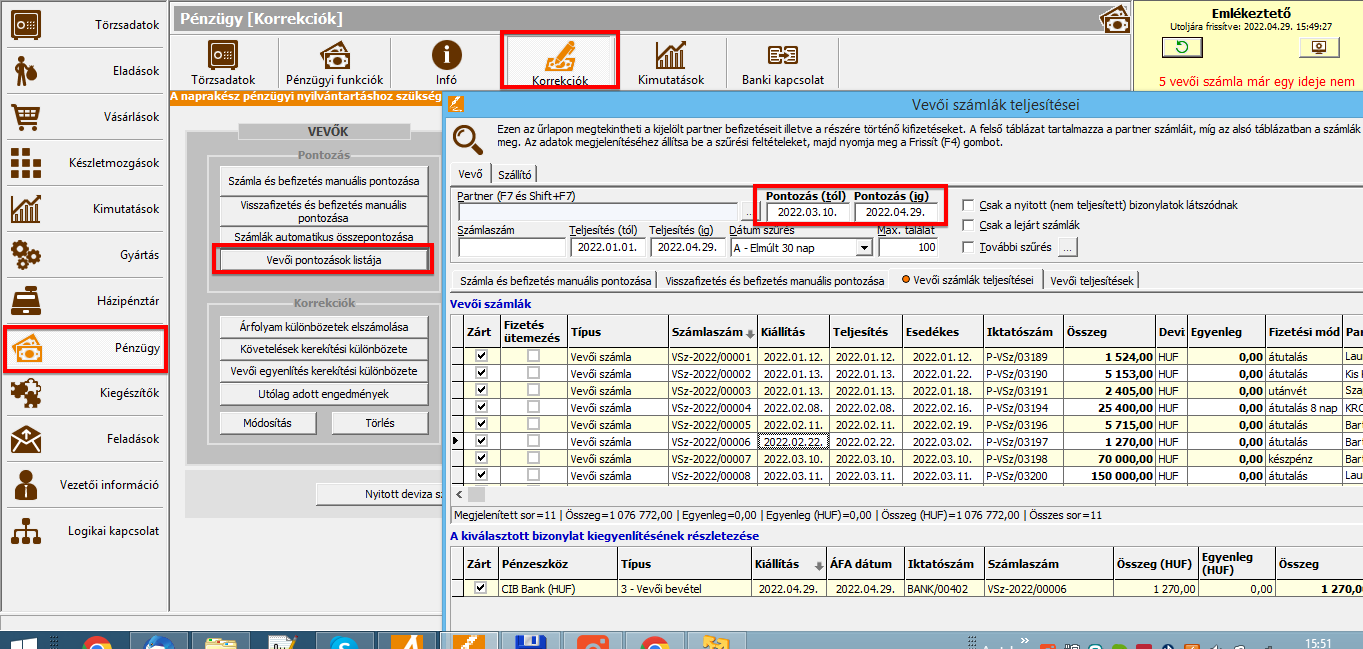Ebben az esetben a rendszer automatikusan összepontozza a számlával a banki fizetést, valamint automatikusan elkészíti az árfolyam különbözet alapján a korrekciós bizonylatot is (árfolyam veszteség /