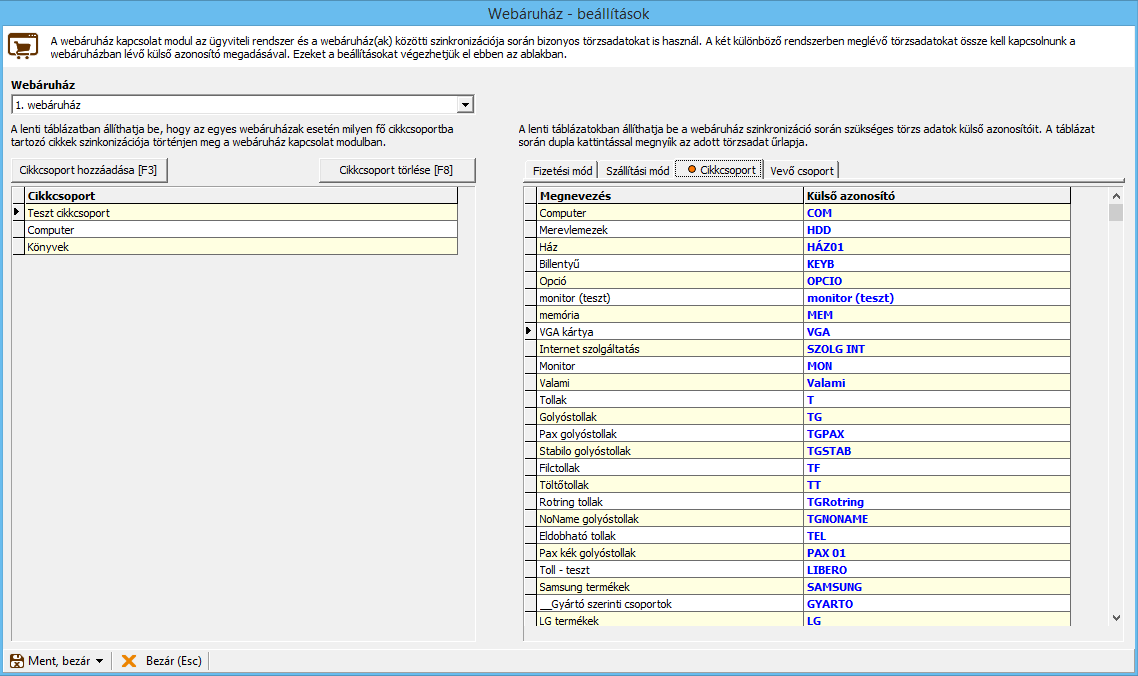 - cikk adatok exportja a webáruházba (alapadatok, árak, kedvezmények)